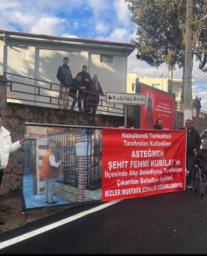 Kubilay Anıtı’na giden yol üzerinde asılan bir pankartta, “Nakşibendi Tarikatları tarafından katledilen Şehit Asteğmen Fehmi Kubilay’ın ilçesinde AKP’li belediye tarafından işten çıkarılan belediye işçileri, bizler Mustafa Kemal’in askerleriyiz” ifadelerine yer verildi.