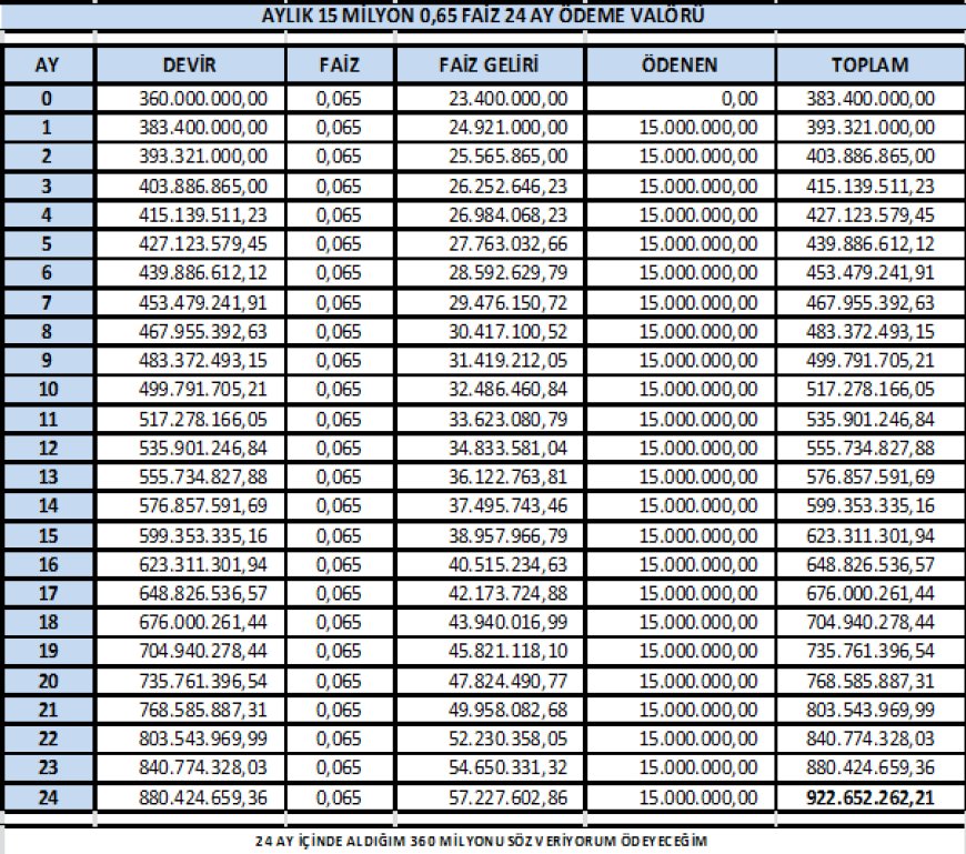 Sizin için bir tablo yaptım, bu tabloda paranın piyasadan nasıl çekildiğini, kapital sahiplerinin piyasadan parayı nasıl hortumladığını görmenizi istiyorum. Ben bir iş adamıyım ve piyasaya 360 Milyon borcum var, bu borcu piyasaya ödemek yerine 0,065 faizle bankaya yatırıyorum ve bir ay sonra aldığım faizi anaparanın üstüne ilave ederek, bir kısmı ile piyasaya olan borcumu faizsiz olarak ödüyorum. Gün sonuna geldiğinde 15 Milyon aylık ödeme yaptığım halde param hiç eksilmediği gibi sürekli artmakta olduğunu görebilirsiniz. 24 Ay sonra 360 Milyon borcumu ödemiş ve 920 Milyon kazanmış oluyorum. Bu tablo, piyasanın zenginler tarafından nasıl sömürüldüğünün tablosudur.
