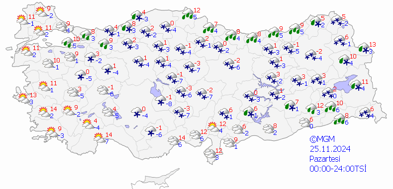 Meteoroloji Genel Müdürlüğü (MGM) 25 Kasım hava durumu raporunu yayımladı.